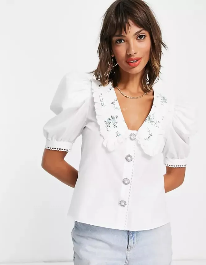 Если ищешь что-то романтичное, выбирай блузку с декорированным воротником. Первый вариант — модель с акцентными пуговицами и нежной вышивкой. Предлагаем сочетать ее с юбкой в бельевом стиле, босоножками на каблуке и атласной косынкой.