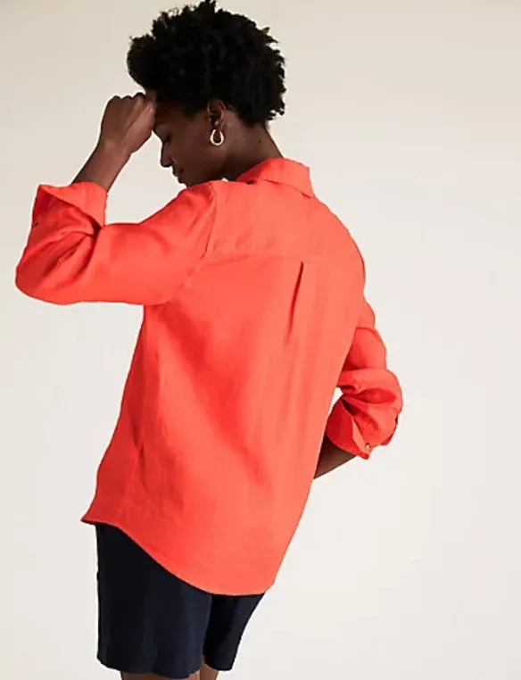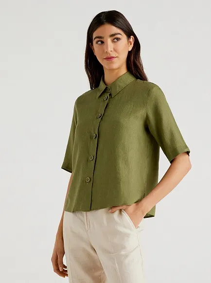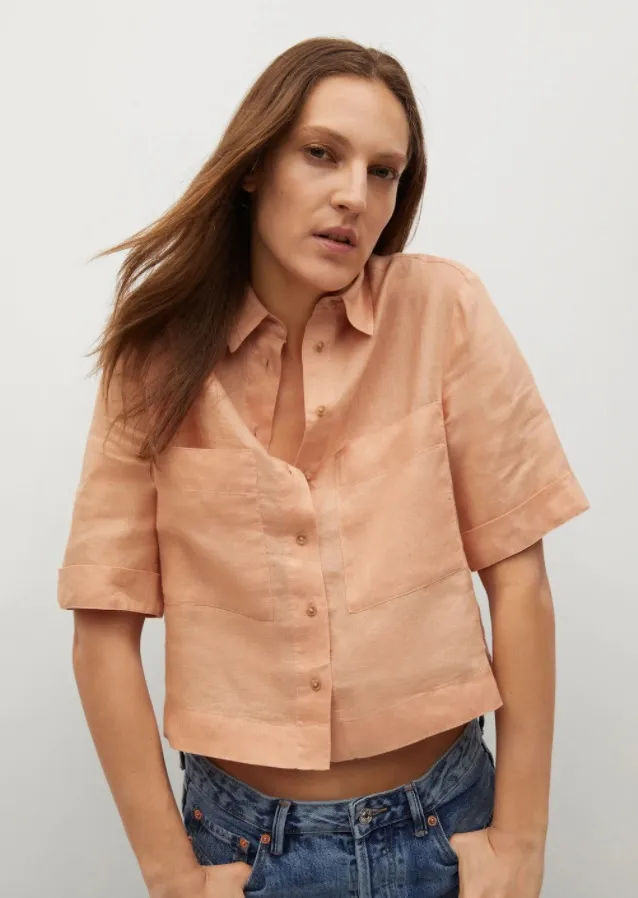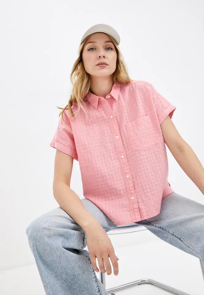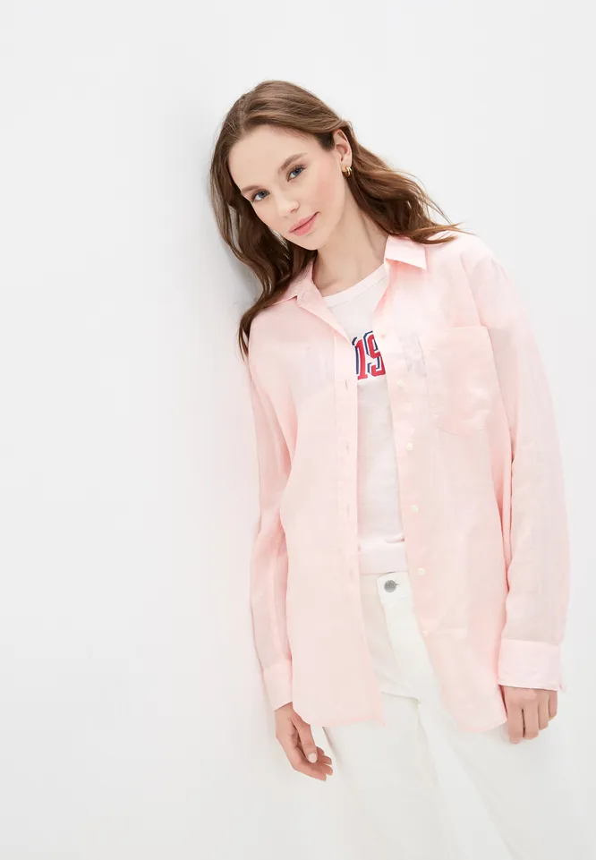 Легкую нежно-розовую рубашку изо льна можно носить на голое тело с шортами, свободными брюками или джинсами. Также она будет стильно смотреться поверх базовых топов.