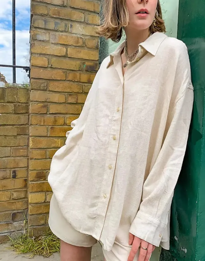 Поклонницам свободного кроя стоит обратить внимание на кремовую оверсайз-рубашку. Можно носить ее навыпуск с шортами в спортивном стиле или надевать поверх кроп-топов, футболок, бралеттов.