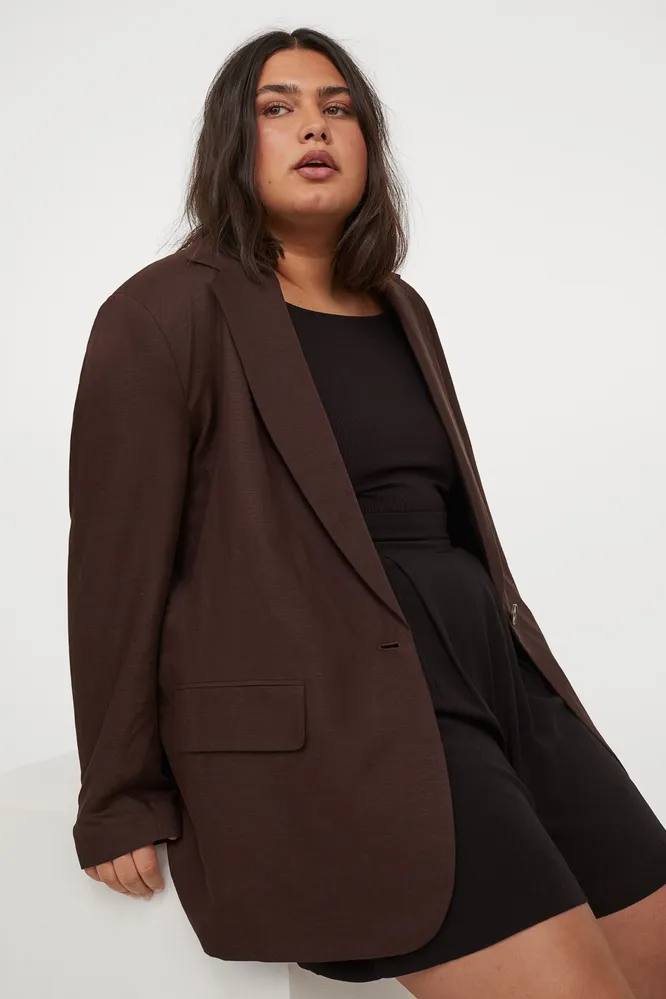 Девушкам plus-size стоит поискать в магазинах женский льняной пиджак больших размеров. Это абсолютно универсальная вещь, которая легко впишется как в офисные, так и в повседневные образы. Наш выбор – модель прямого кроя благородного коричневого оттенка. Он уместно смотрится не только в летнем, но и в осеннем гардеробе. В жаркое время года сочетай его с легкими шортами и базовыми топами, а осенью – со строгими брюками, водолазкой и остроносыми ботильонами на каблуке.