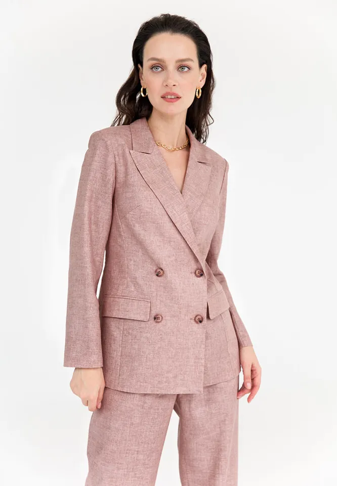 Строгий, но в то же время женственный двубортный пиджак изо льна розового цвета. Он стильно смотрится со светлыми расклешенными брюками и остроносой парой обуви на каблуке. Если добавить нарядные серьги и акцентный аксессуар для волос, можно смело отправляться на модную вечеринку.
