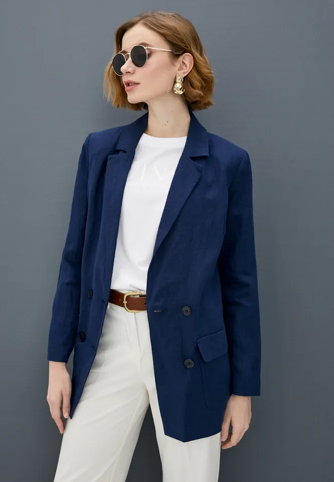 Идеальный выбор для офисного гардероба – женский синий льняной пиджак. Выбирай двубортную модель прямого кроя и сочетай с брюками-бананами в тон, строгой юбкой по фигуре. В качестве базы используй легкую шелковую или шифоновую блузу, тонкую водолазку или льняную футболку. Что касается цветов, то синий лучше всего сочетается с белым, бежевым, светло-серым, черным, небесно-голубым. Добавить жакету шика поможет аккуратная брошь, надетая на лацкан.