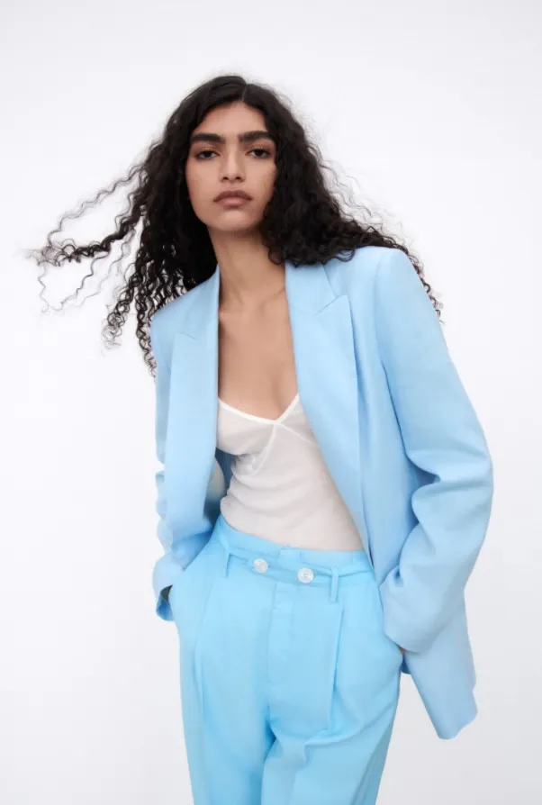 Стильная альтернатива вариантам в классической цветовой гамме – голубой женский льняной пиджак. Расслабленный крой, нежный цвет, отсутствие пуговиц, придающих строгость, — этот пиджак идеально впишется в повседневные луки. Например, можно носить его поверх укороченных топов или бралеттов с шортами и кожаными сандалиями. Если на улице прохладно, меняй шорты на белые или голубые джинсы. Для создания элегантного делового аутфита предлагаем дополнять жакет льняными брюками в тон, а в качестве аксессуаров выбрать пару минималистичных украшений и небольшую фактурную сумку через плечо.