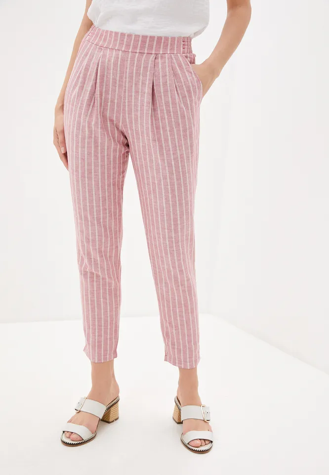 В летней капсуле обязательно должны быть светлые брюки. Наш выбор — модель кремового цвета в тонкую полоску.