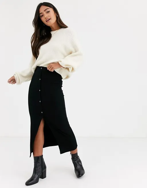 Лучший зимний вариант — юбка из мягкого трикотажа. Нашли для тебя модель макси в рубчик, которая станет отличной сезонной базой. Носим ее с худи, джемперами свободного кроя, облегающими водолазками и огромными теплыми свитерами с высоким горлом.