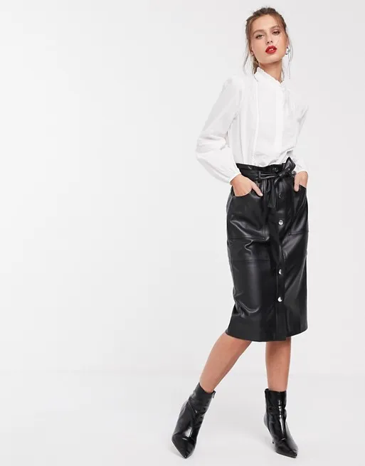 Хочешь оживить скучный офисный наряд? Тогда выбирай юбку-карандаш, сшитую из кожи. Она смотрится достаточно строго, чтобы ходить в ней на работу, при этом даже в сочетании с классической белой рубашкой получается яркий, заметный образ. Дополняем лук ботильонами kitten heels и лаконичной сумкой-тоутом.