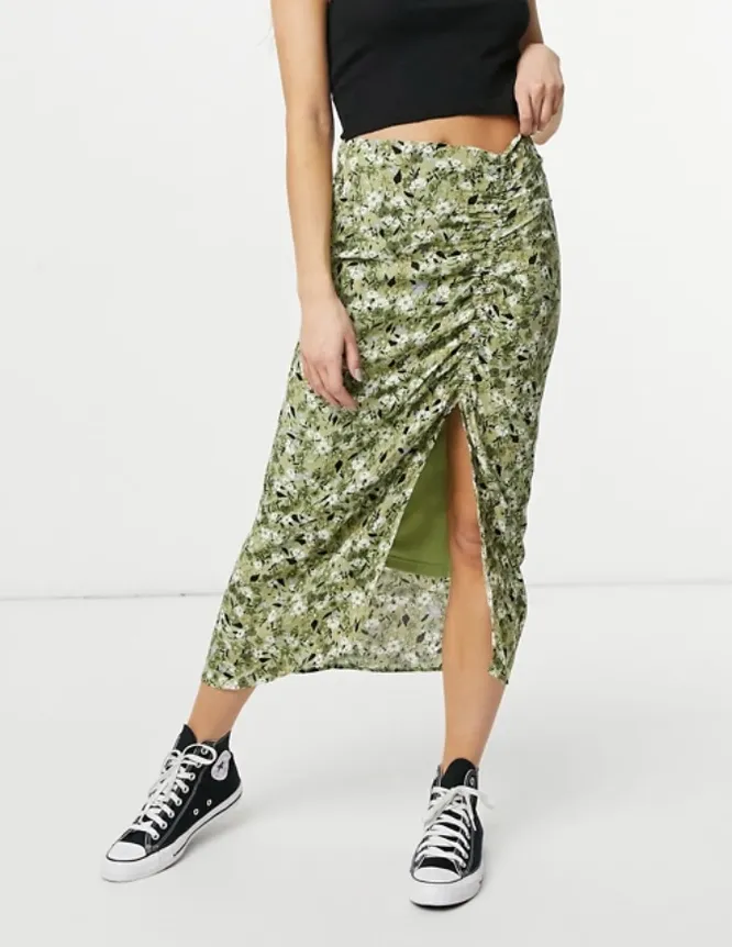 Для романтичных луков выбирай юбку с цветочным принтом, разрезом и сборками. Сочетай ее с топом или блузкой с рукавами-буфами, а чтобы добавить остроты, надевай поверх объемную косуху.