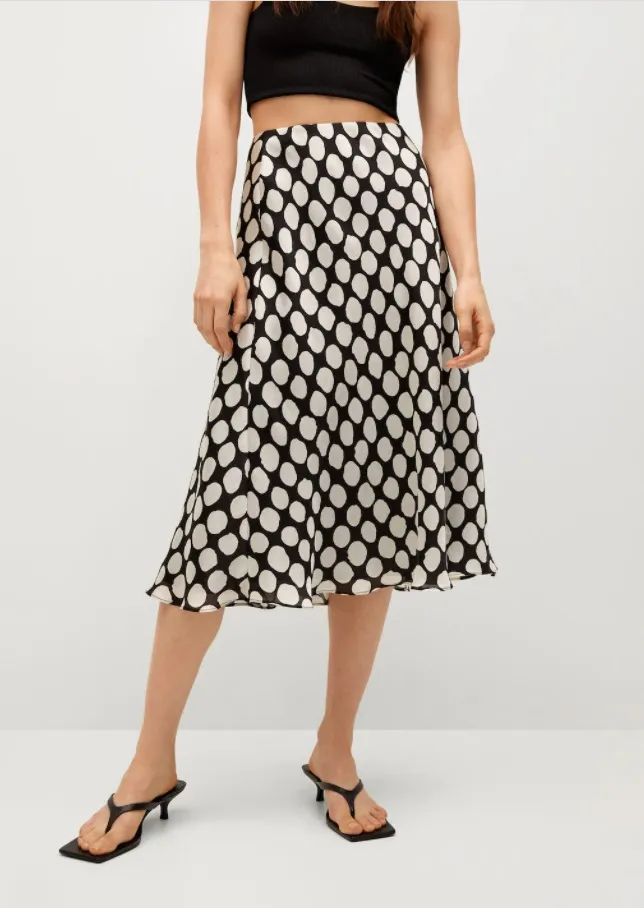 Лоснящаяся юбка с геометрическим принтом отлично смотрится и со строгим жакетом, и с романтичной блузкой, и с нарядным топом, и с оверсайз-свитером.