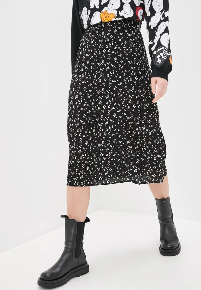 Вариант на каждый день — легкая черная юбка с нейтральным цветочным принтом.
