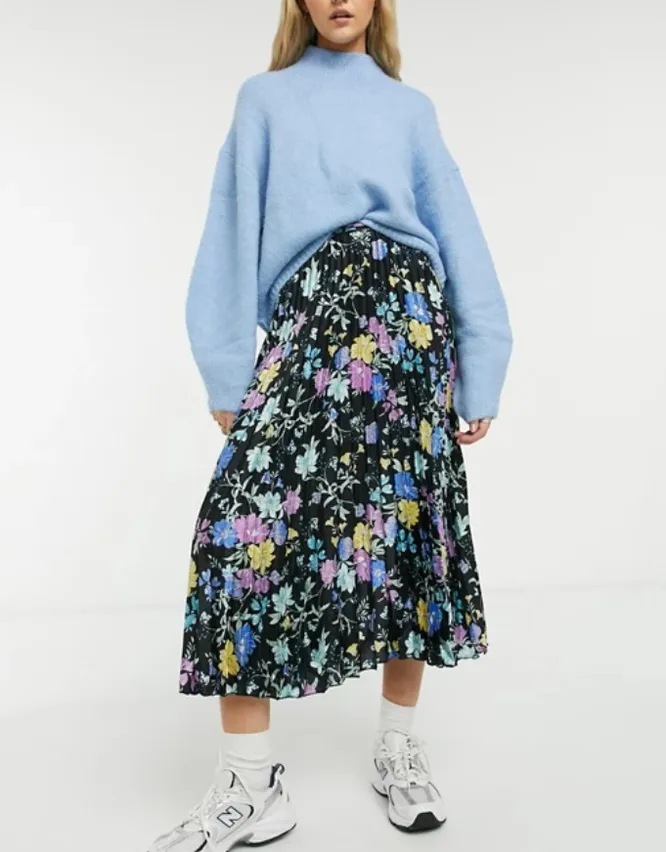 Интересным дополнением к весеннему гардеробу станет юбка плиссе с цветочным принтом. Чтобы она органично смотрелась в образе, дополняй ее однотонным верхом простого кроя и минималистичным аксессуарами.