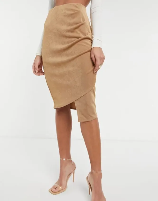 Классическую юбку-карандаш замени на модель асимметричного кроя с запахом. Чтобы образ смотрелся органично, дополняй ее более простыми и нейтральными вещами.