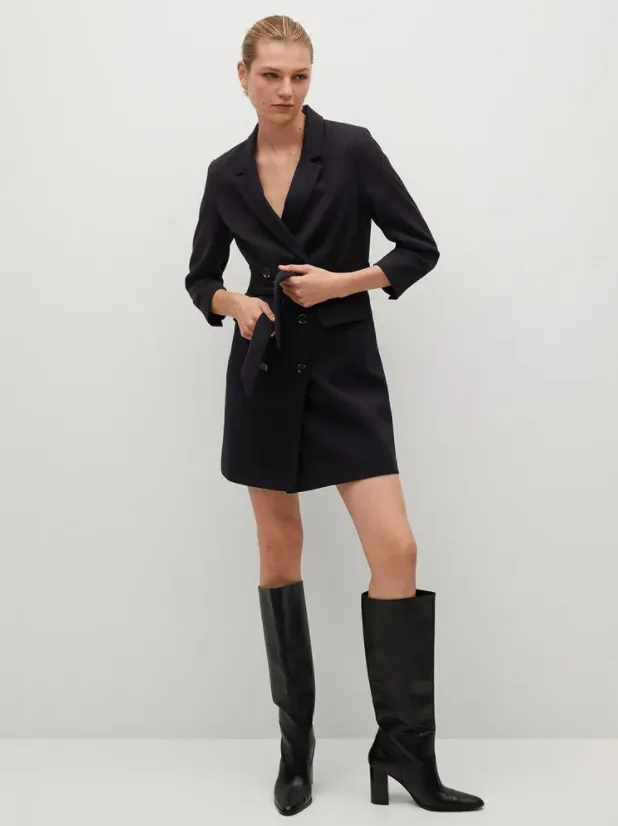 Маленькое черное платье-пиджак подойдет как для офиса, так и для похода в ресторан или на вечеринку. Модель достаточно свободно сидит на фигуре и имеет пояс, который делает акцент на талии. Можно носить его соло или надевать под него контрастную водолазку, чтобы добавить образу цвета. Из обуви к нему идеально подойдут ботфорты-чулки, сапоги в жокейском стиле, классические лодочки и остроносые ботильоны на каблуке.
