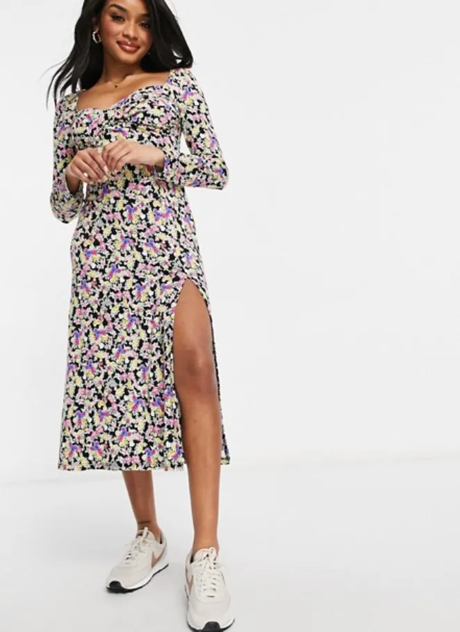 Платья миди с квадратным вырезом и цветочным принтом завоевали любовь модниц по всему миру. Они подчеркивают достоинства фигуры и легко стилизуются самыми разными аксессуарами и обувью. Советуем выбрать модель с длинным разрезом на подоле – такое платье добавит образу изюминки и поможет визуально вытянуть силуэт. Носить его можно с джинсовой курткой и кроссовками, если собираешься на прогулку, или комбинировать с босоножками на шпильке и нарядной сумкой, если предстоит поход на модную вечеринку.
