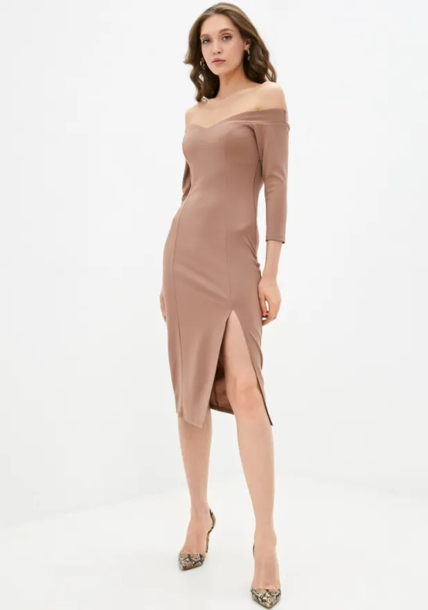 Элегантное платье по фигуре с открытыми плечами – лучший способ подчеркнуть природную сексуальность и при этом не выглядеть вульгарно. Модель из плотной ткани в нейтральном бежевом цвете легко сочетается и с туфлями, и с сапогами, и с ботильонами. В качестве аксессуаров выбирай изящный кулон на тонкой цепочке и минималистичный клатч-конверт.