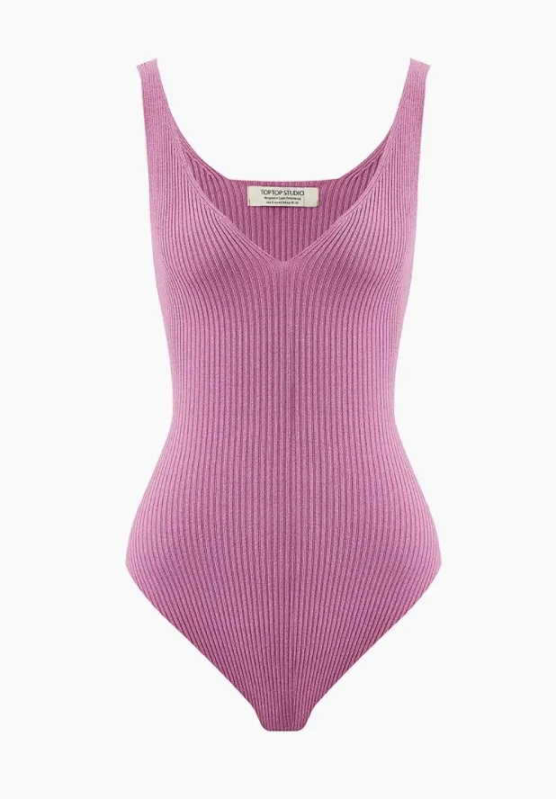 Плотное трикотажное боди в рубчик с V-образным вырезом красиво обрамляет фигуру. Это отличная база под пиджаки, куртки и кардиганы. Кроме того, розовый — один из самых трендовых цветов этого сезона.