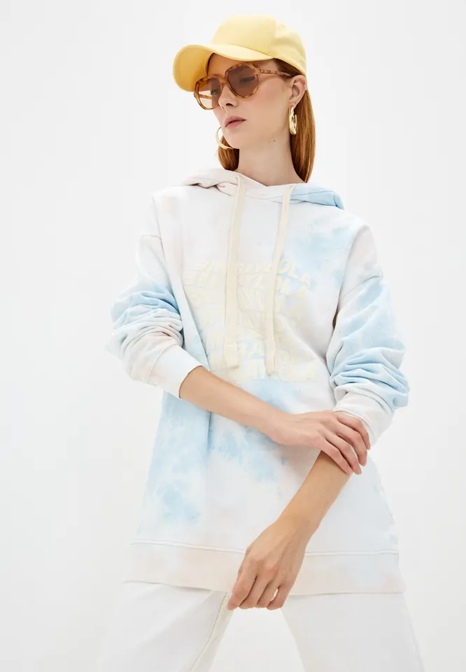 Длинное худи с принтом тай-дай станет отличной основой для ярких образов на каждый день. Оно гармонично смотрится как, например, с белыми джинсами, так и с цветными брюками. Дополняй толстовку массивной цепью на шею или милыми пинами.