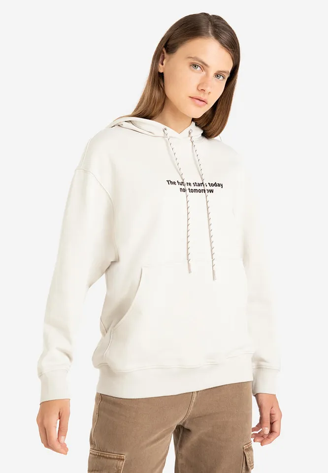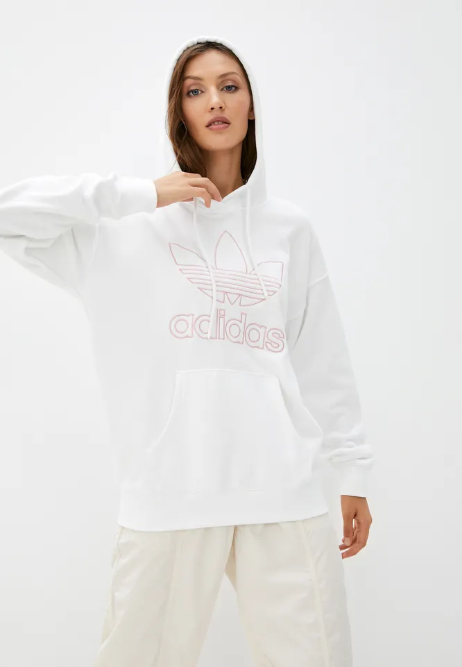 Если ты занимаешься спортом на свежем воздухе, часто выезжаешь на природу или просто предпочитается спортивный стиль, тебе подойдет свободное спортивное худи с минималистичным дизайном. Наш первый фаворит – белое худи с логотипом. Можно носить его с леггинсами, джоггерами в тон и массивными кроссовками, джинсами и расслабленными брюками на резинке. Благодаря крою худи не стесняет движения во время тренировок, а базовый цвет и лаконичный дизайн позволяют легко комбинировать вещь с самыми разными предметами гардероба.