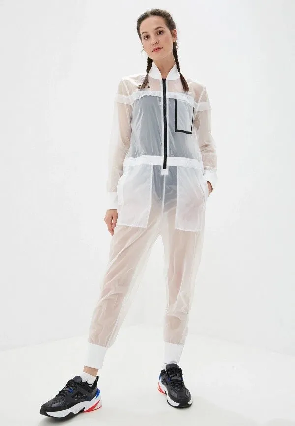 Стильный прозрачный комбинезон-дождевик — идеальный вариант для тренировок на улице и вечерних беззаботных прогулок.