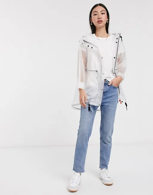 Прозрачно-белый плащ с накладными карманами защитит тебя от дождя и украсит твой повседневный образ.