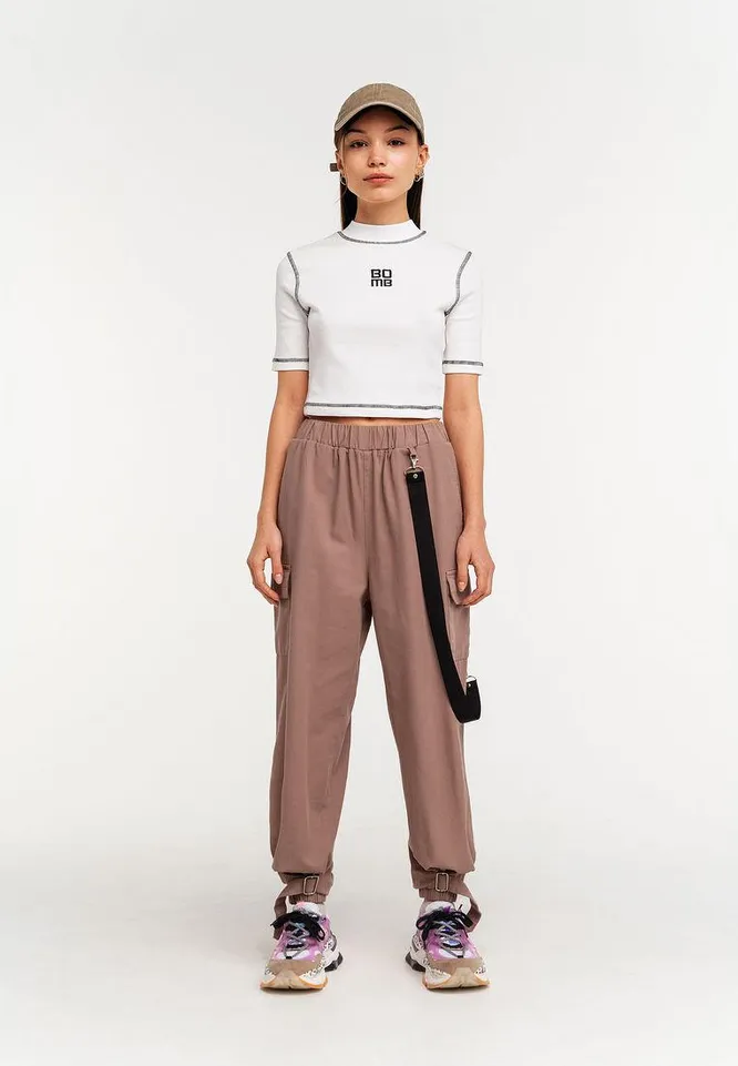 С чем носить джоггеры с карманами или модели в спортивном стиле, чтобы выглядеть модно? Звезды стритстайла, например, сочетают их с яркими боди с высокими вырезами. Добавить образу остроту поможет массивная цепь на шею. Поверх можно надеть объемный бомбер или дерзкую косуху.