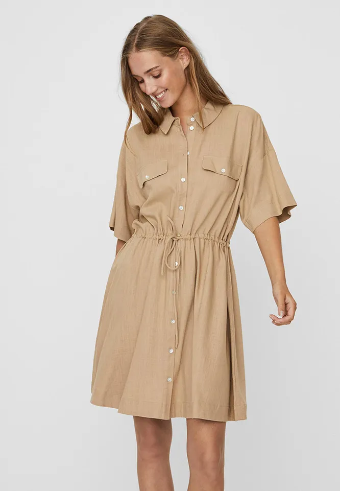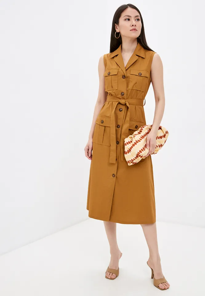 Лаконичное платье с накладными карманами нейтрального цвета кэмел – отличная основа повседневных и деловых образов. Дополняй его босоножками на каблуке и солнечными очками формы «кошачий глаз».