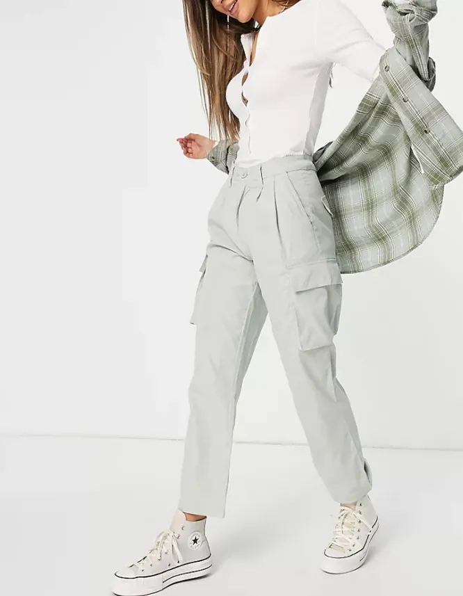 Пастельные брюки карго стильно смотрятся с белой оверсайз-рубашкой и массивными сандалиями.