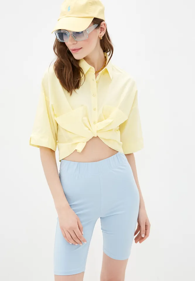 Сделать образ более нежным и кокетливым поможет желтая рубашка с узлом на талии.