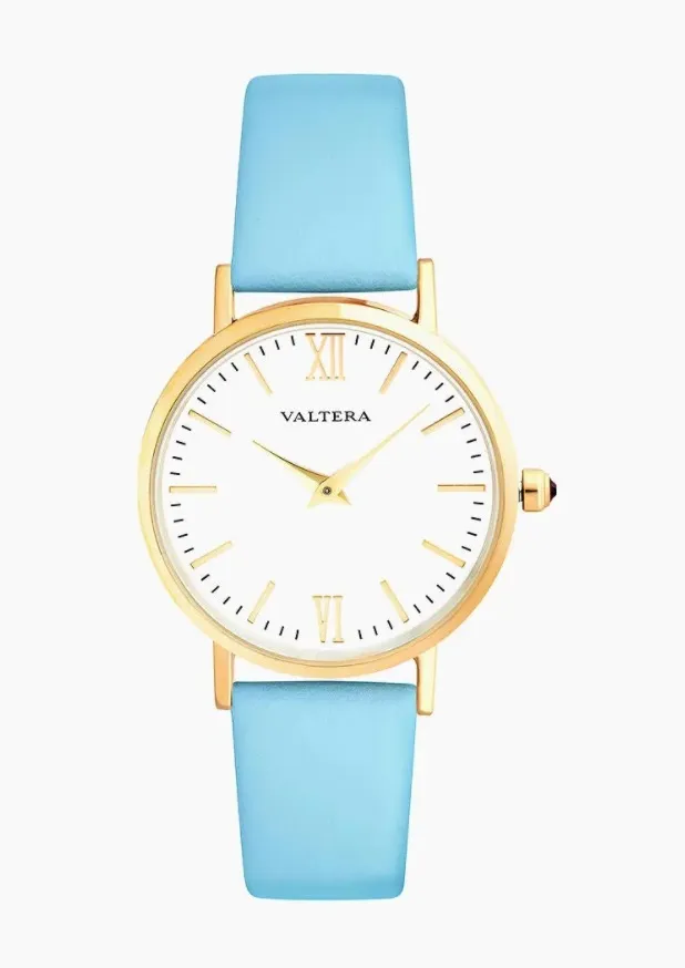 Если хочешь добавить образу цвета, выбирай лаконичные часы с голубым ремешком.