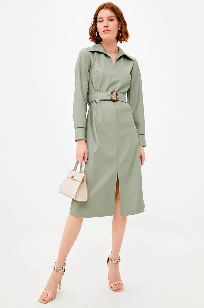 Еще один стильный вариант из кожи, только в оливковом цвете. Особенно интересно в этой модели смотрится пояс с черепаховой пряжкой — он не только подчеркивает талию, но и служит ярким акцентом.