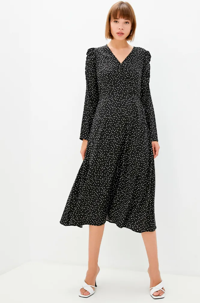 Легкий, струящийся материал и принт горошек придадут твоему деловому образу мягкости. V-образный вырез зрительно удлинит шею, объемные рукава акцентируют плечи, а запах сделает талию визуально более тонкой.
