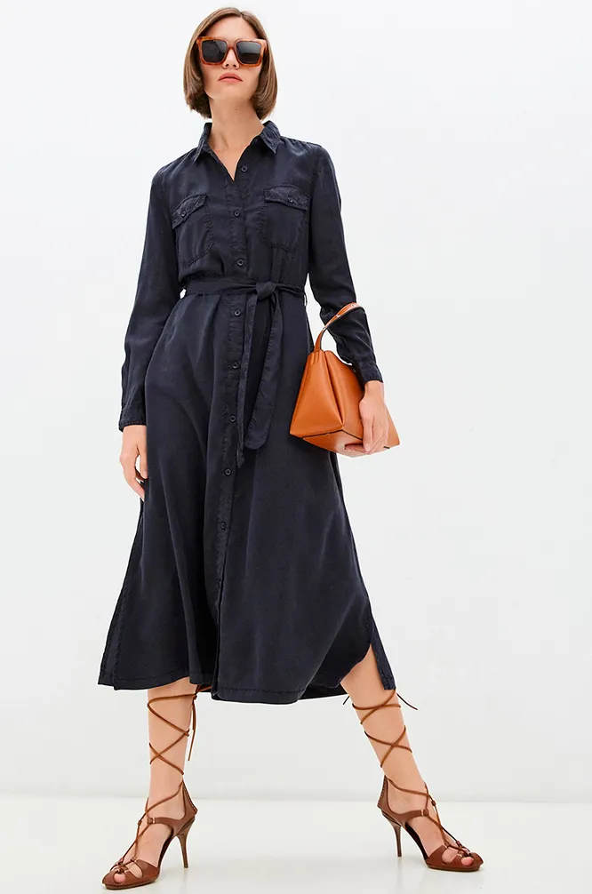 Отлично впишется в твоей деловой гардероб платье-рубашка. Мы любим эту модель не только за ее простоту и универсальность, но и за ее свойство визуально стройнить фигуру. Акцент на талию, отложной воротник, юбка-клеш и комфортная длина — формула идеального наряда для офиса.