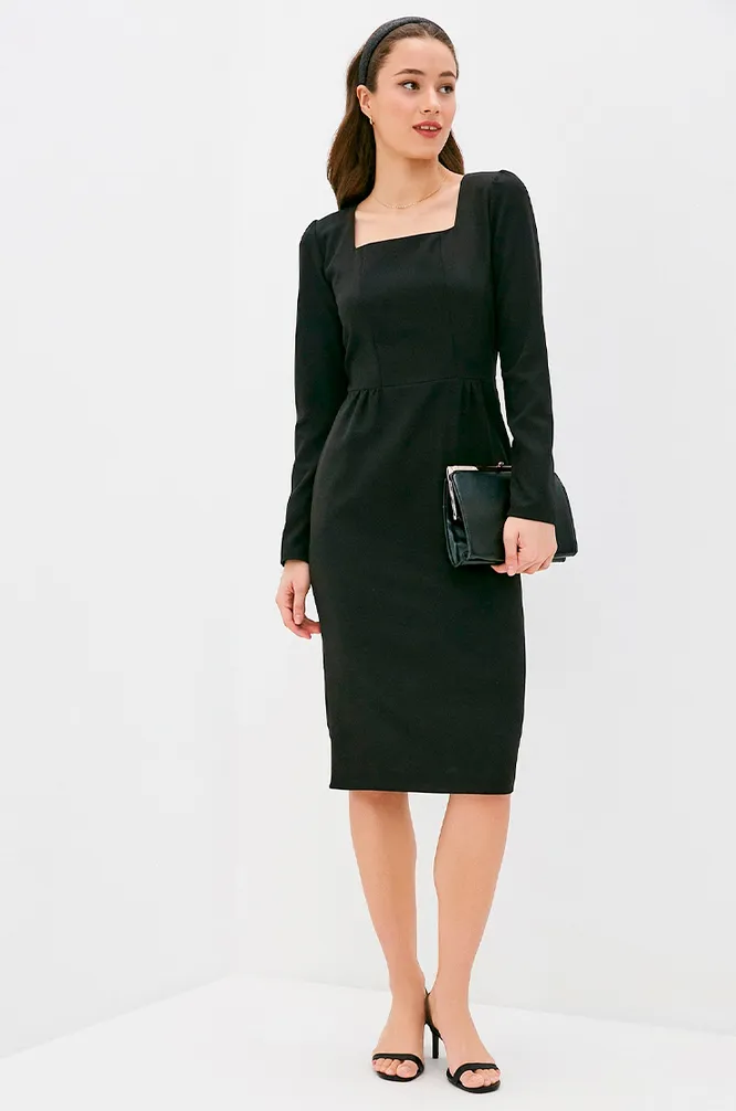 Платье-футляр — классика офисного гардероба. Мы предлагаем тебе немного поэкспериментировать с кроем и выбрать модель с актуальным вырезом каре и акцентными плечами. Смотрится очень элегантно! Кстати, ты не только сможешь носить такое платье на работу, но и легко составишь с ним образ на вечер.