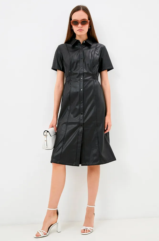 Еще один способ разбавить строгий офисный дресс-код — поиграть с фактурой наряда. Черное платье-миди из кожи смотрится вполне сдержано, но при этом совсем не кажется скучным. А встроенный эластичный пояс и застежка на пуговицы моделируют фигуру, делая ее стройной и выразительной.