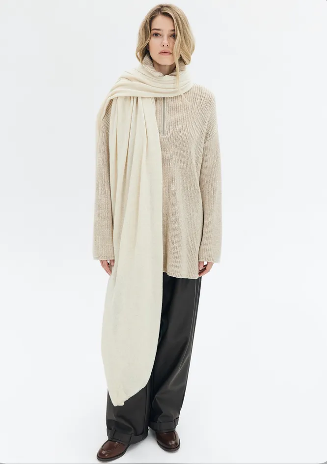 Зимой толстый шерстяной шарф был необходимостью, а весной мы сделаем ставку на легкость. Тем более, невесомый аксессуар прекрасно дополнит образ с платьем и пальто в стиле тихой роскоши: элегантный look – всегда хорошая идея.