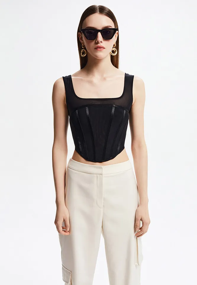 Еще один модный тренд весны-лета – 2022 для женщин – корсеты. Это может быть как классический корсет, надетый на голое тело или поверх футболки, рубашки, блузы, так и корсетный топ или платье. И носить их можно не только на вечеринки, но и в повседневной жизни. Звезды ститстайла предпочитают сочетать их с брюками и джинсами на высокой посадке, а также носить поверх полупрозрачных платьев миди. Похожие образы мы могли видеть на показах Sportmax, Dolce & Gabbana, Acne Studios и других брендов.