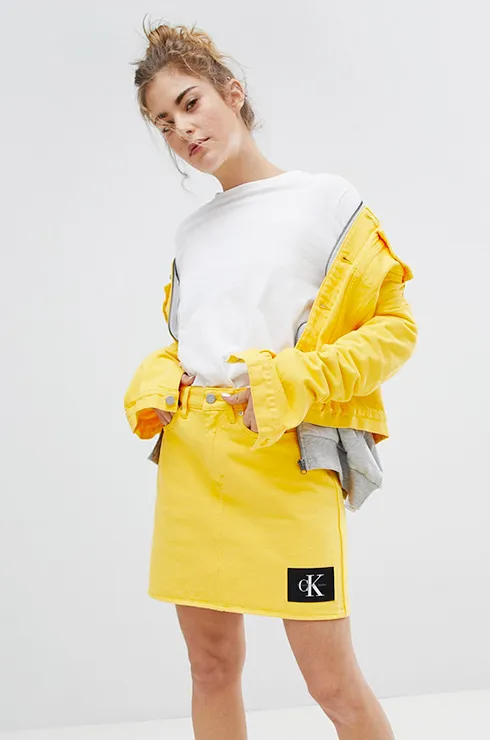 Юбка самого весеннего и жизнерадостного цвета лучше всего будет смотреться в комплекте с базовой светлой футболкой и белыми кроссовками. В таком виде стоит отправиться на модную вечеринку или прогулку по парку.