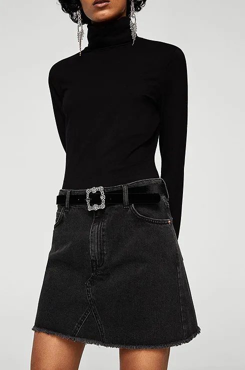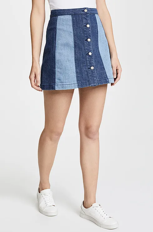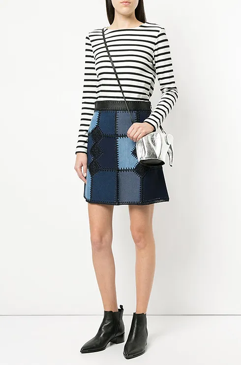 Мини-юбка из комбинированного денима подойдет для встречи с подругами. Она хорошо сочетается с яркими джемперами и толстовками.