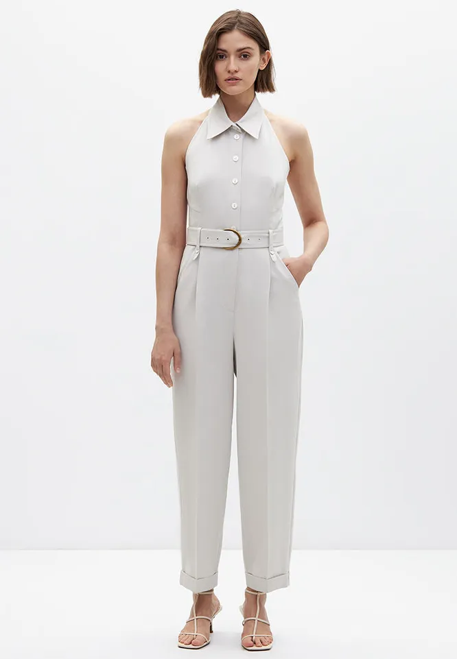 Базовый вариант — бежевый комбинезон из вискозы. К нему подойдут практически любые аксессуары и обувь.