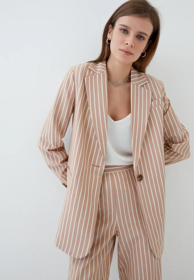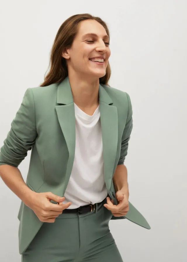 Для деловых аутфитов и образов в стиле smart casual выбирай приталенный жакет с жесткими плечами. Модель гармонично смотрится с брюками-дудочками, прямыми джинсами, платьями и юбками по фигуре.