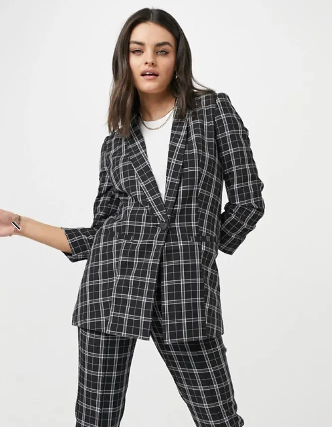 Классический блейзер в крупную монохромную клетку легко впишется и в строгие, и в повседневные расслабленные луки. Можно носить его с джоггерами, широкими трикотажными штанами, брюками-бананами.