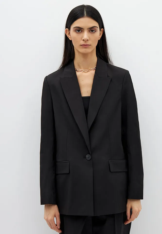 Однобортный черный пиджак прямого кроя станет отличным дополнением как к деловым и повседневным образам, так и к вечерним нарядам. Можно носить его с классическими брюками, кожаными мини-юбками, лоснящимися платьями-комбинациями.