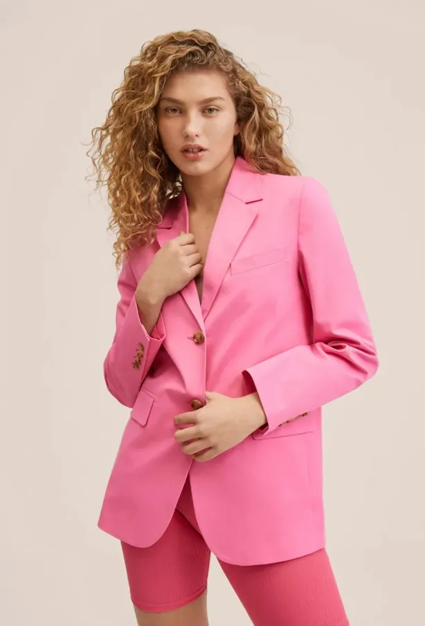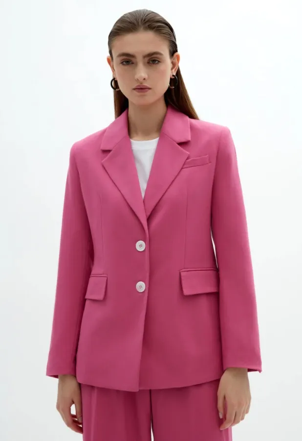 Маджента — романтичный и загадочный оттенок розового, который смотрится одновременно ярко и спокойно. Нашим фаворитом стал однобортный пиджак классического кроя. Его ты сможешь носить в офис с белой рубашкой и нейтральными брюками, на вечеринку — поверх коктейльного платья, на прогулку в парке — с футболкой и джинсами.