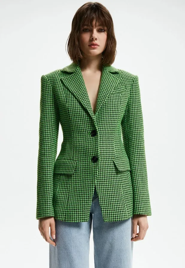 И снова зеленый! Но уже в клетку. Этот приталенный блейзер станет удачным дополнением и к деловому аутфиту, и к коктейльному наряду. В первом случае носи его с полуприлегающей юбкой или брюками сигаретами, во втором — с кожаной мини-юбкой и туфлями на шпильке.