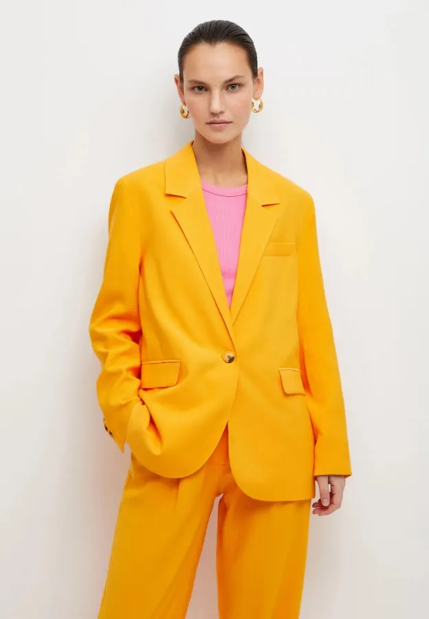 Оранжевый — хит сезона. Особенно круто он сочетается с насыщенным фиолетовым цветом. Поэтому этот пиджак советуем замиксовать с фиолетовыми брюками или юбкой — ярко, контрастно, необычно! Главное, не увлекайся аксессуарами, чтобы не перегрузить аутфит.