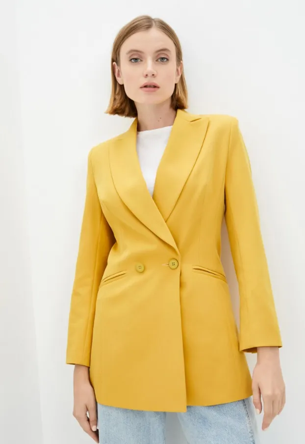 Приглушенный желтый цвет — то, что нужно весеннему гардеробу. Удлиненный приталенный блейзер будет стильно смотреться поверх базовой футболки любого цвета. В качестве низа выбирай юбку-карандаш длины миди, широкие брюки на высокой посадке или прямые светлые джинсы.