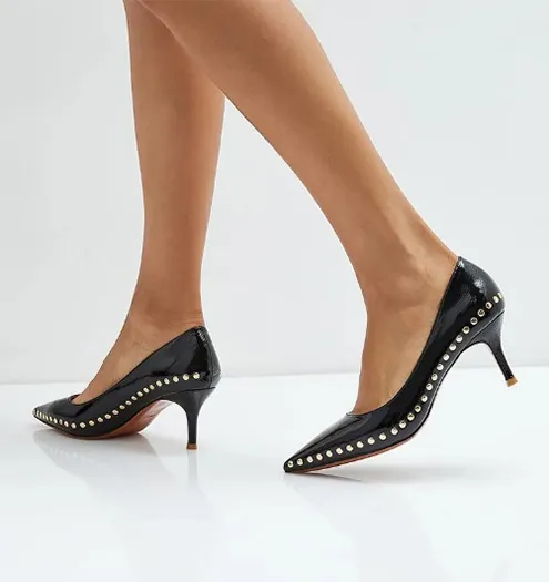 Если ты поклонница стиля гранж, не обязательно носить только грубые ботинки. К роковому наряду вполне подойдут «лодочки» с клепками на низком каблуке.