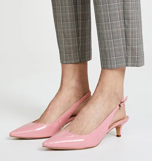 А чтобы заставить коллег позавидовать до наступления первых холодов, тебе достаточно будет купить эти розовые туфли kitten heels с открытой пяткой. Они хорошо сочетаются с укороченными брюками или юбкой-карандашом.