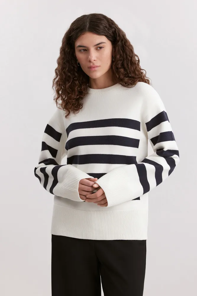 В общем, логику ты поняла: чтобы освоить новый морской тренд, нужно брать знаковые для него вещи – и миксовать с чем-то контрастным по фактуре и объему. Получается своеобразная игра: ты собираешь образы-паззлы, переставляя кусочки мозаики в новых комбинациях. Базовый набор для игры мы уже собрали, с тебя требуется только сделать первый ход!