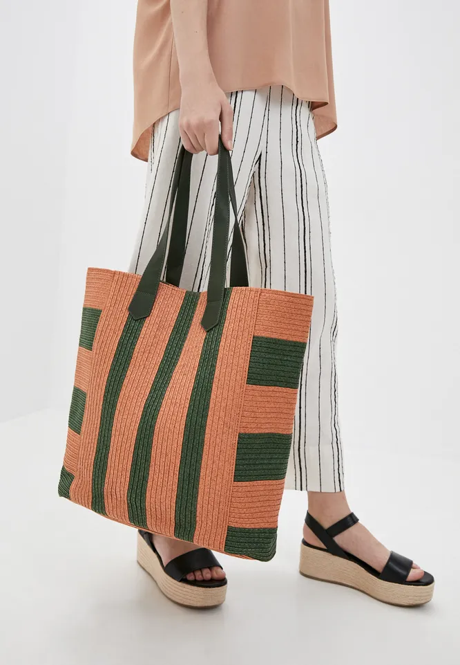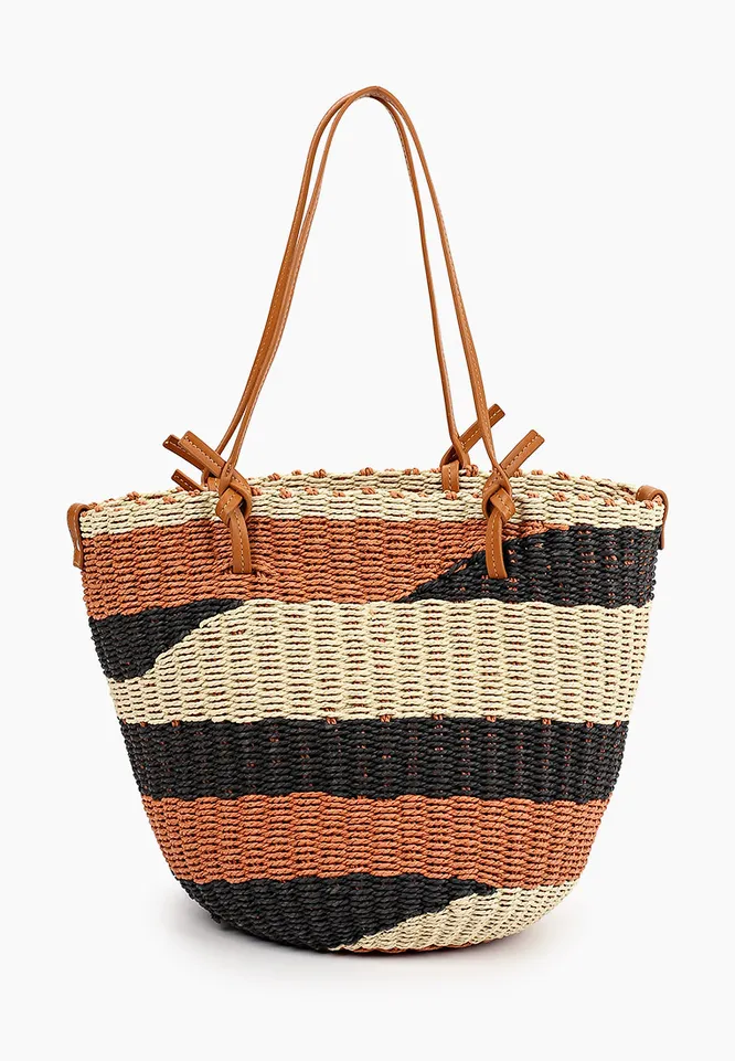 Вместительная сумка из искусственной соломки с контрастными вставками. Можно носить ее с широкими джинсами и рубашкой с коротким рукавом в городе, а на пляже — с ярким бикини и летящей туникой.