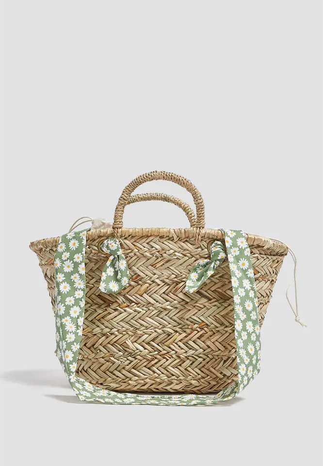 Сумка-корзинка с лентой, усыпанной ромашками, гармонично сочетается с широкополой шляпой и платьем миди с запахом.
